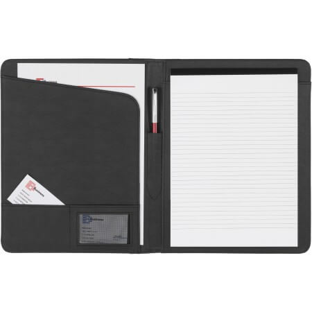 A4 Bonded leather conference folder, includes different pockets, a note pad, an elasticated pen loop (pen not included) and metal engraving plate.