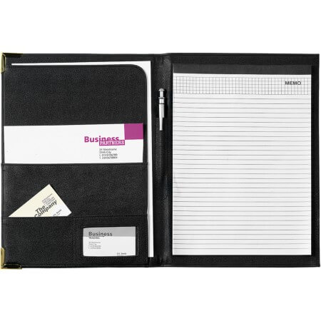 A4 PU Conference folder. Note pad (item 8400) and pen not included. Colours: blue/silver gilt corners, black/gold gilt corners.