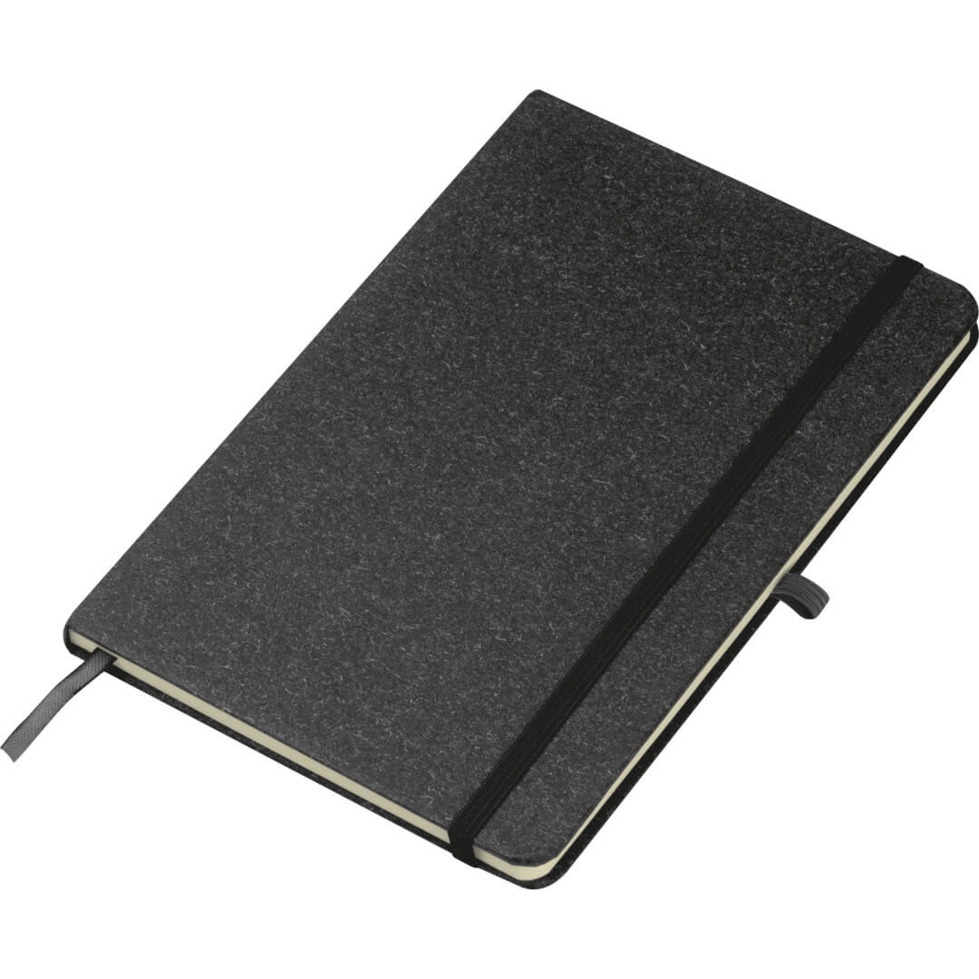 A5-Notizbuch mit Einband aus recyceltem Karton, Lesezeichen, Kugelschreiberschlaufe, 160 gepunkteten Seiten und Gummizugverschluss. Druckverfahren Tampondruck.