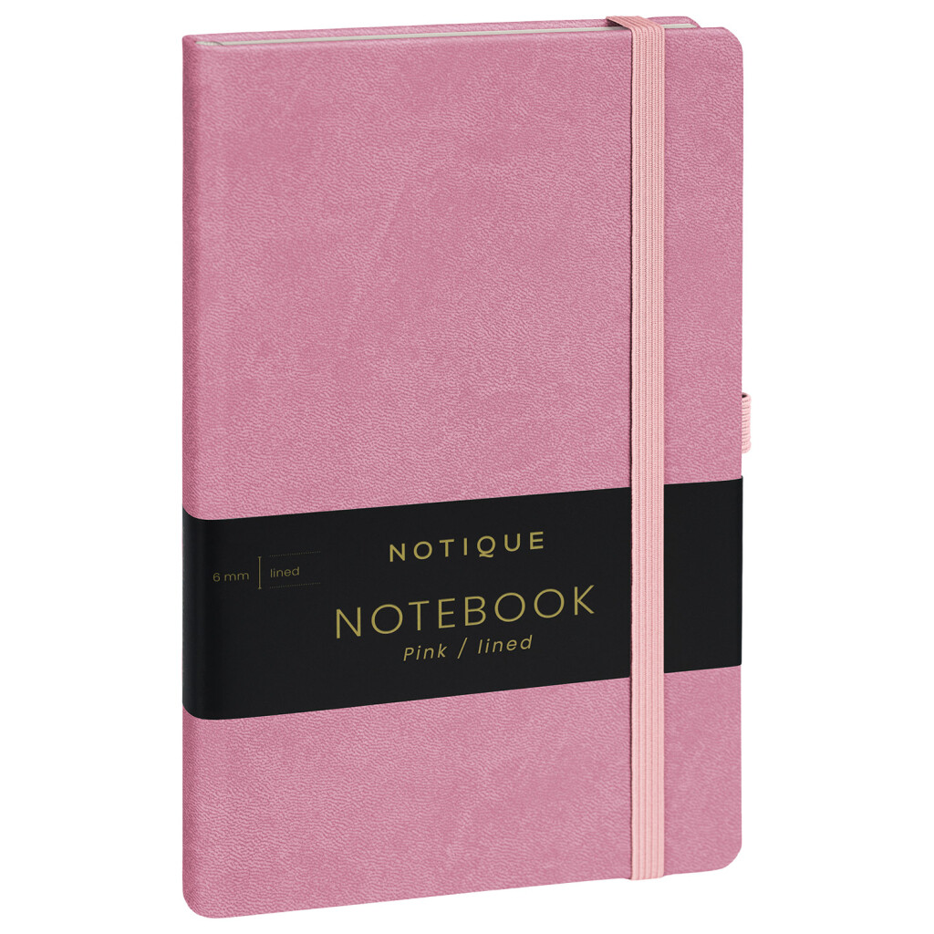 Soft feel notebook (approx. A6) with a PU cover, with 96 lined double sided sheets, ribbon marker and coloured, elastic nylon band for closing.