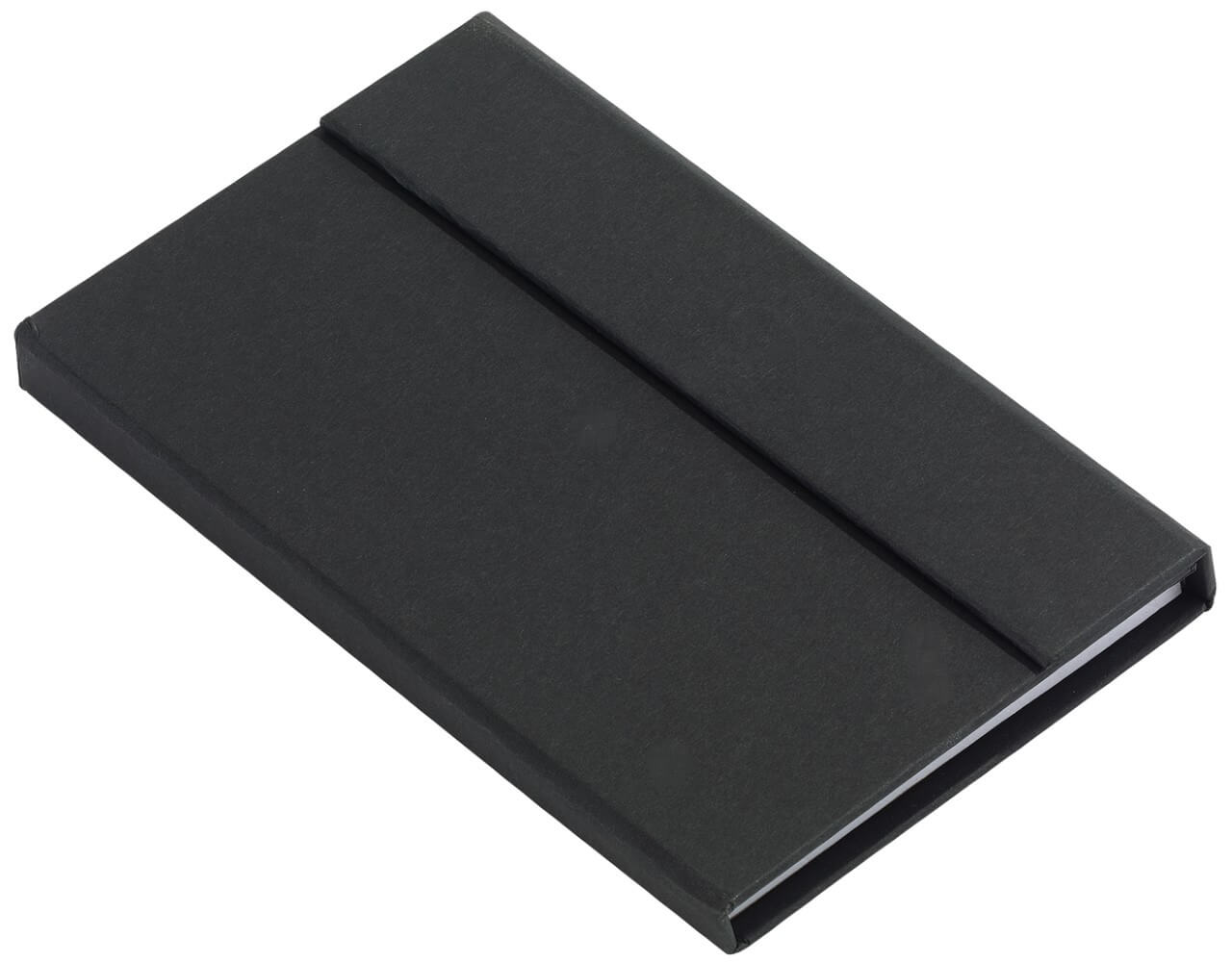 Notizbuch PENZ in handlicher Größe mit abgerundeten Ecken, inkl. kugelschreiber aus karton (schwarze tinte), gummiband in passender farbe, 70 seiten, 70g / m², 5 verschiedenfarbige selbstklebende etiketten - aus recycelbaren materialien schwarz papier