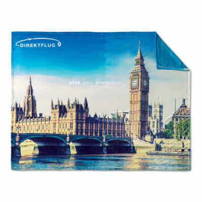 Fleecedecke (240 g/m²), mit samtiger Oberfläche und Anti-Pilling-Behandlung. Satinband und Karte zur Personalisierung. 1500 x 1200 mm | Cartoncino: 160 x 130 mm