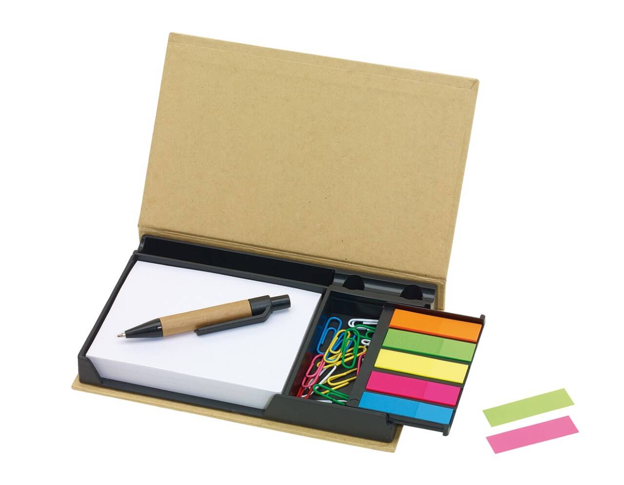 Memo-Box "Drawer" : Abreißblock mit 120 Notizzetteln, 20 Büroklammern in verdeckter Schublade – befindet sich unter den 5 x 20 verschiedenfarbigen Markierflaggen – 1 Mini-Kugelschreiber (schwarzschreibend), Einband aus recycelbarer Pappe