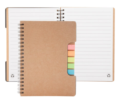 Notizbuch (60 Seiten) aus recycling Papier, mit Haftnotizen (5 x 25 Stk.).
