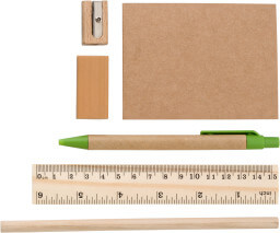Nonwoven pencil case, ECO-style, including a ruler, ballpen with green accents, pencil, pencil sharpener, eraser, and notepad.
