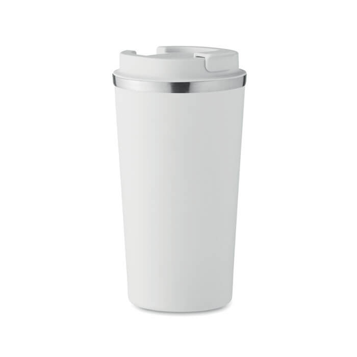 Doppelwandiger Edelstahl-Vakuumbecher mit 380 ml Fassungsvermögen und transparentem Deckel mit Trinköffnung.