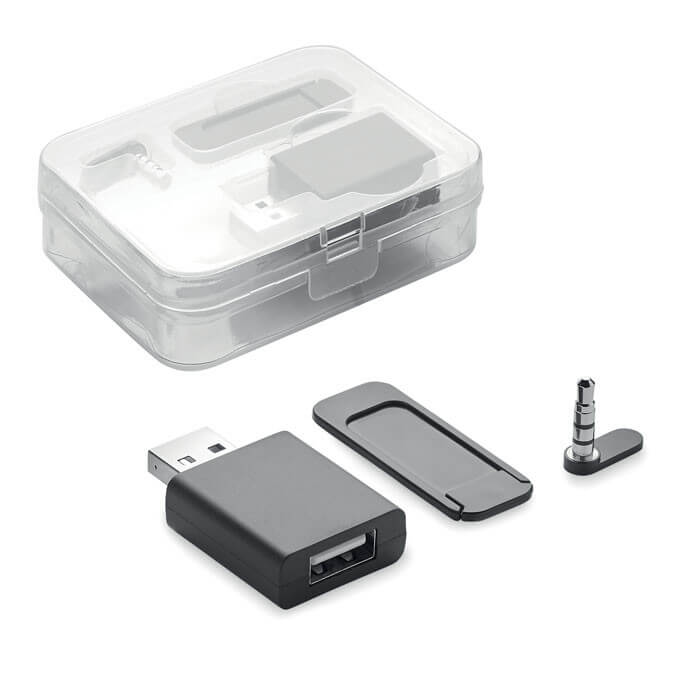 Ladekabel mit Gummi- und Metalloberfläche und beleuchtetem Logo. Ausgestattet mit drei Anschlüssen (USB-C, Android, iPhone) und USB-A und USB-C Ausgang. Es kann bis zu drei Geräte gleichzeitig aufladen. Kabellänge (einschließlich Steckern): 10 cm. Gesamtlänge des Kabels: 1 Meter. Das Kabel besteht aus recyceltem PET-Kunststoff und die Verpackung aus recyceltem Papier und recyceltem Kunststoff.