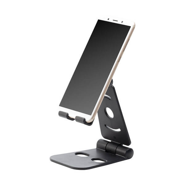 Zusammenklappbarer und verstellbarer Ständer für Mobiltelefone. Sein intelligentes Design macht ihn zu einem mühelosen Hilfsmittel bei Tele- und Videokonferenzen. Die durchbrochene Konstruktion ermöglicht das Einstecken von Kopfhörern über eine Minibuchse, wodurch das Handy stabil und aufrecht gehalten wird. Bei Nichtgebrauch lässt er sich leicht auf ein kleines Maß zusammenklappen.