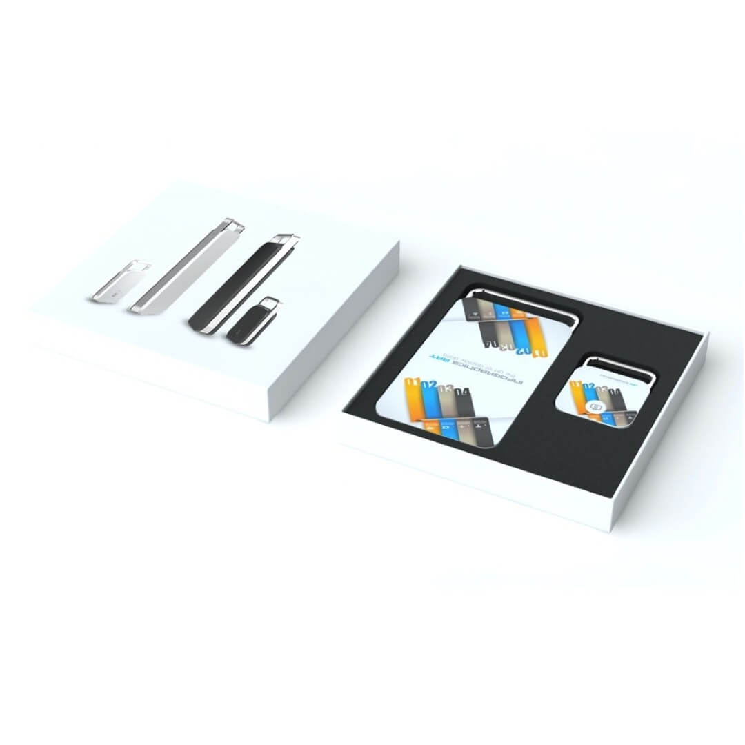 SELFIE SET - Power Bank mit Kapazität bis 2000 bis 6000 mAh und universalem Bluetooth-Auslöser fürs Handy! Bis zu einer Entfernung von 10 m können Sie den Auslöser mit Ihrem Smartphone oder iPhone steuern und so Fotos in Positionen machen, die mit einem Handy normal nicht möglich sind. Den BT-Auslöser können Sie als Schlüsselanhänger bei sich tragen und jederzeit sofort verwenden. Lange Akkulaufzeit (ca. 6 Monate bei täglich 10facher Verwendung) Power Bank mit großer Fläche zum Bedrucken (auch CMYK, beidseitig). In Geschenkschachtel verpackt.