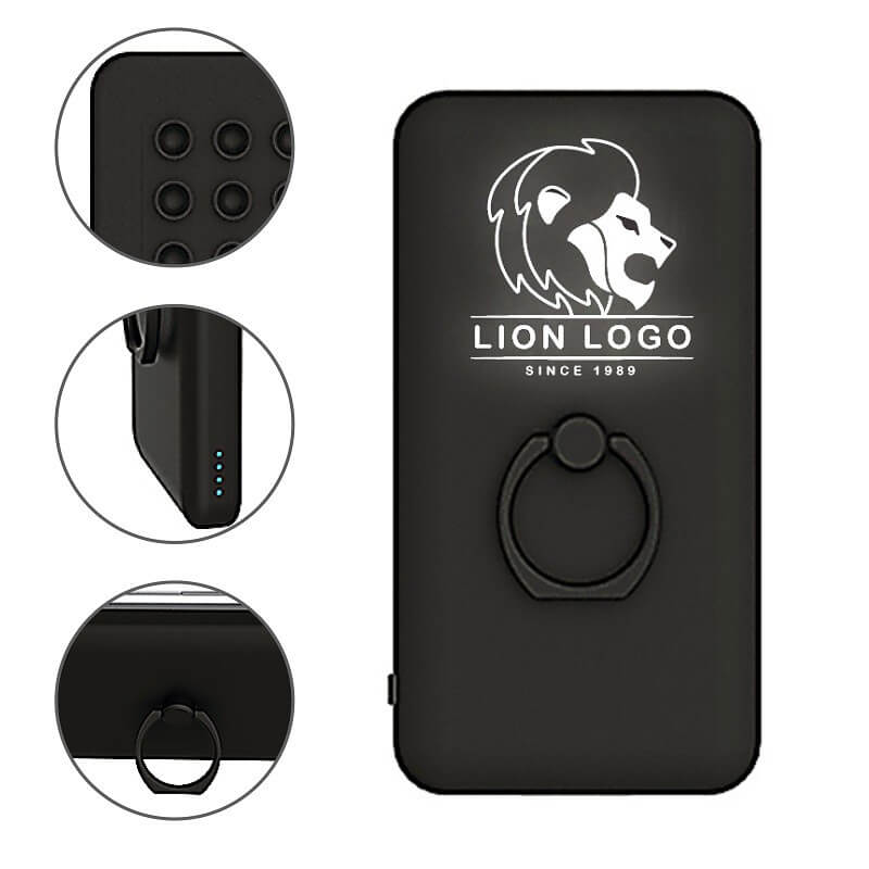 Die Power Bank mit zwei Ausgängen und einer Kapazität von 5000 mAh ist ideal für den täglichen Gebrauch. Die Saugnäpfe auf der Rückseite dienen zur festen Befestigung am Telefon. Dank der dünnen Dimensionen des externen Ladegeräts können Sie Ihr Handy immer noch verwenden. Zum Aufladen dienen zwei 2,1 A und 1 A Ausgänge, wodurch Sie wählen können, wie schnell Sie Ihr Gerät aufladen möchten. Auf die Rückseite der Power Bank kann ein beliebiges Logo platziert werden, das beim Aufladen leuchtet. Ein weiteres praktisches Merkmal ist ein Fingerring, der als Ständer dient.