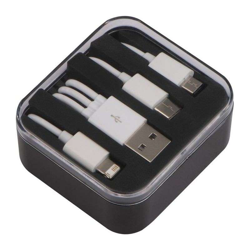 Sada USB káblov, ktorá obsahuje USB, microUSB koncovku a kábel pre nabíjanie zariadení Android a iOS. Balené v plastovej krabici.