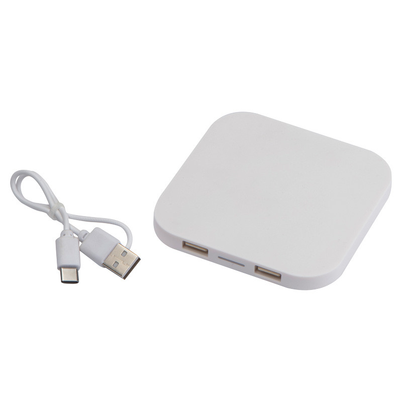 Kabelloses Ladegerät aus Kunststoff mit 2 USB-Anschlüssen. Das Ladekabel ist im Paket enthalten. Lädt alle QI-fähigen Smartphones auf.