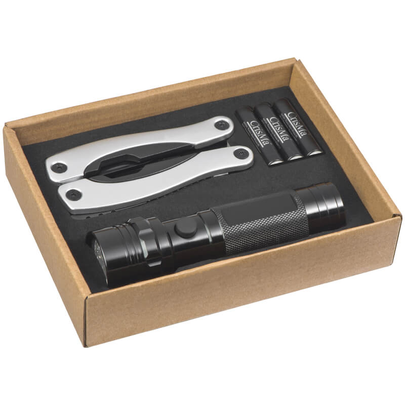 Fackelset aus massivem Metall mit 14 LEDs und Multifunktionswerkzeug mit Zange, Säge, Dosenöffner, Nagelfeile, Flachschraubendreher, Kreuzschraubendreher, extra scharfem Messer in schwarzer Geschenkbox. Wir werden Ihr Logo in Gravur platzieren.