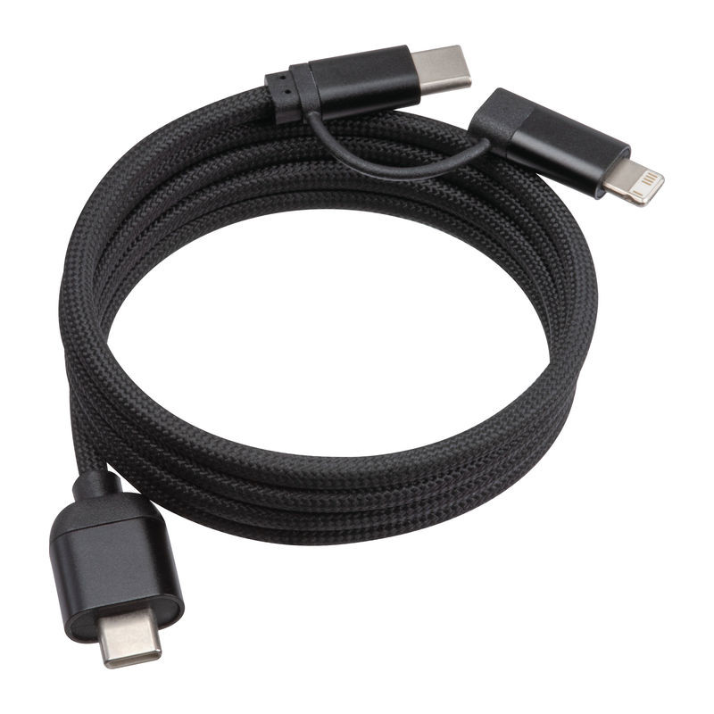 Dieses Kabel verfügt über einen USB-A- und USB-C-Eingangsanschluss sowie einen kombinierten USB-C-, Micro-USB- und Lightning/Micro-USB-Ausgangsanschluss. Dank all dieser Anschlüsse können Sie die meisten Smartphones mit iOS-/Android-Betriebssystemen, die meisten Kameras, Powerbanks und Kopfhörer aufladen. Das Kabel mit einer Länge von 100 cm besteht aus recyceltem Aluminium und RPET-Material.