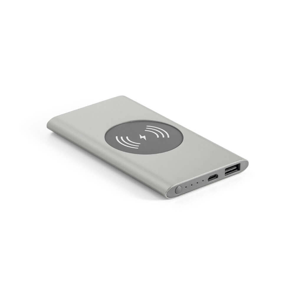 Powerbank mit wireless Ladefunktion aus Recyceltes Aluminium (100 % rAL). Tragbarer Akku mit 4'000 mAh Kapazität, Ladestandsanzeige, einem USB-C-Eingang, einem USB-A-Ausgang und 5 W kabelloser Ladeleistung. Kompatibel mit mobilen Geräten mit kabelloser Ladetechnologie. Enthält ein USB-C-Ladekabel. Wird in einer Geschenkbox geliefert. 123 x 70 x 10 mm