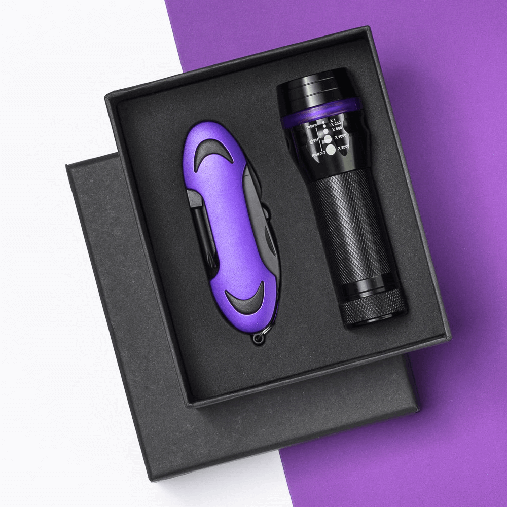 Praktická súprava Colorado I obsahujúca svietidlo a nožík. Svietidlo napájané LED diódou. Vyrobená z hliníka. Vytvára lúč svetla. Nožík so sklopnou rukoväťou. Obsahuje vývrtku, otvárač na fľaše, hviezdicový skrutkovač , pilníček a nožničky. Súprava je zabalená do elegantnej škatuľky.