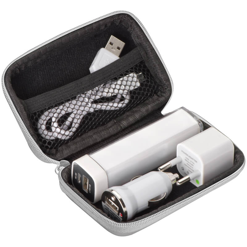 Ein Reise-Set, bestehend aus einem USB-Zigarettenanzünder-Ladegerät, einem EU-Stecker zum Anschluss eines beliebigen Geräts über ein USB-Kabel an eine Steckdose und einer Powerbank mit 2200mAh Kapazität. Wir platzieren Ihr Logo mit einer Siebdruckmaschine.