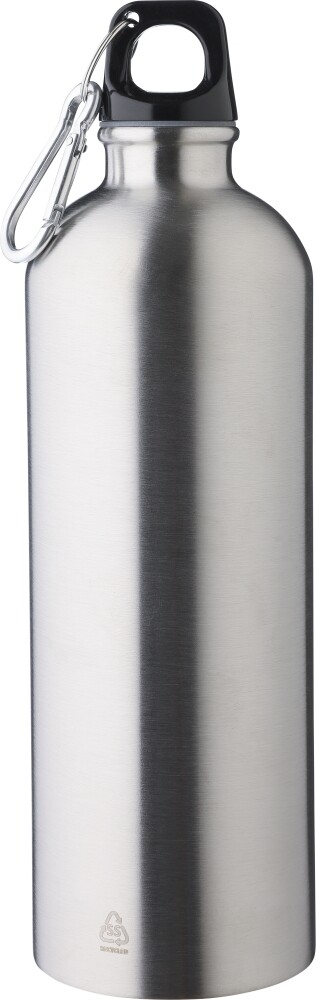 Recycled stainless steel single-walled bottle with a 750 ml capacity, PP lid, and silver aluminum carabiner. Features a recycled engraved logo on the front. Not dishwasher safe. High: 25,5 cm