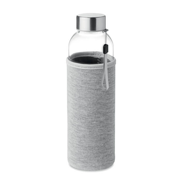 Glass bottle (500 ml) with neoprene sleeve. The metal cap has a wrist band attached. Only for cold beverages.