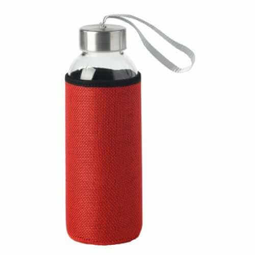 Glass bottle (500 ml) with neoprene sleeve. The metal cap has a wrist band attached. Only for cold beverages.