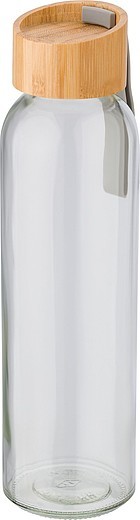 Auslaufsichere Glasflasche mit Bambusdeckel, Jutehülle, mit Aufhängekordel und 500 ml Fassungsvermögen. Siebdruckverfahren.