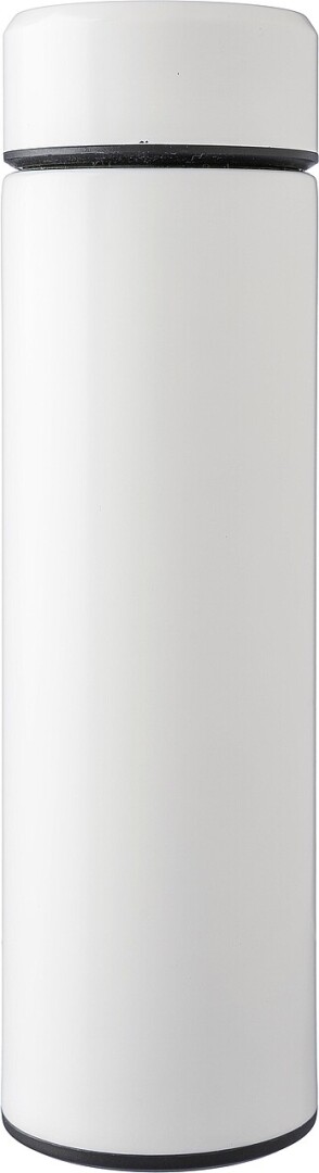 Stainless steel double-walled drinking bottle (425 ml) with a built-in, removable tea sieve. The interior is made of stainless steel 304, and the exterior is stainless steel 201. Individually packaged in a brown cardboard box. Size: 6,3 x 6,3 x 22,7 cm