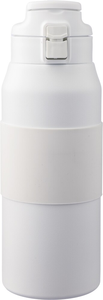Stainless steel double-walled drinking bottle (800 ml) with a silicone grip on the body, straw, PP lid, and carrying handle. Made of 304 stainless steel. Push button to open or close the spout. Keeps contents hot for 8 hours and cold for 12 hours. Individually packaged in a brown cardboard box. Dimensions: 8,8 x 8,8 x 24,5 cm