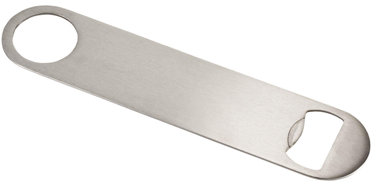Flaschenöffner aus rostfreiem Stahl mit Holzoberfläche.