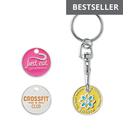 Kovový prívesok na kľúče so žetónom, 2-farebná jemná glazúra na 1 strane žetónu je zahrnutá v cene. Materiál: poniklovaný železný žetón (0,50 €, 1 € alebo nový 1 €) s kovovým príveskom na kľúče. Balené v sáčku a voliteľne s plnofarebnou obojstrannou papierovou kartou (do 12x6cm/300gr).