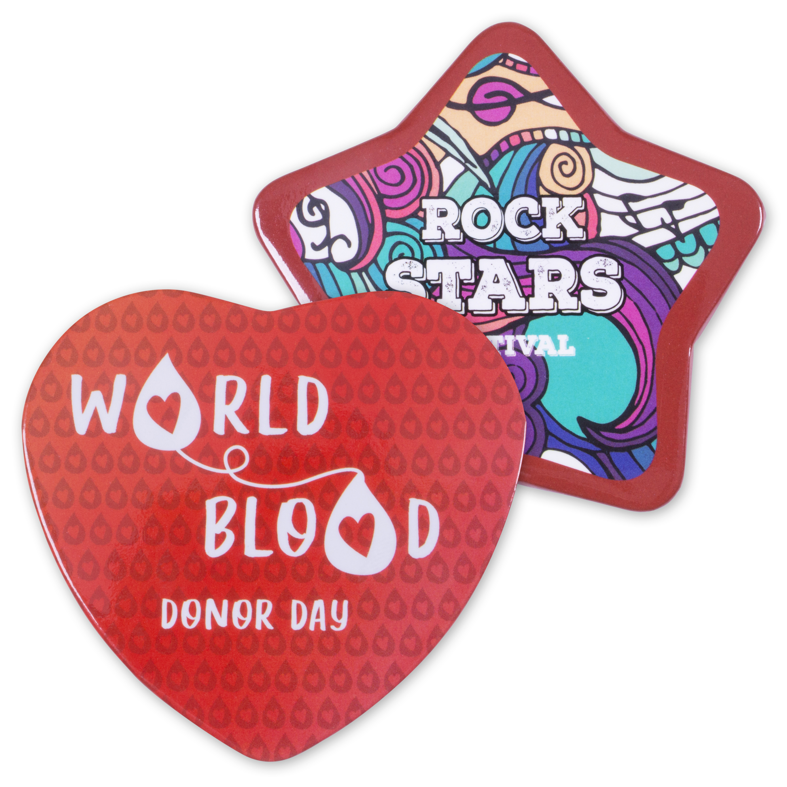 Odznak (butón) v tvare srdca alebo hviezdy s plnofarebnou potlačou na papierovom podklade so zatváracím špendlíkom na zadnej strane. Každá položka je zabalená v sáčku.