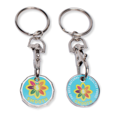 Žetón z poniklovaného železa (0,50 €, 1 € alebo nová 1 € ) s plnofarebnou potlačou loga a imitáciou tvrdej glazúry. Dodáva sa s kovovou kľúčenkou zabalenou v sáčku a voliteľne s plnofarebnou obojstrannou papierovou kartou (do 12x6cm/300gr). Vrátane nákladov na nastavenie. Jednostranná potlač v cene.