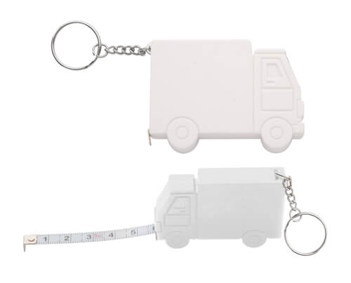 Maßband aus Stahl mit Schlüsselanhänger in Form eines LKW's; Bandlänge: 1 Meter.