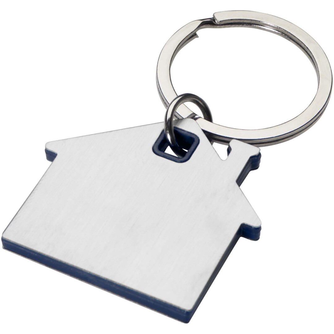 Schlüsselanhänger in Hausform mit einer Edelstahlplatte mit mattem Effekt auf Vorder- und Rückseite und einem farbigen Kunststoffchip in der Mitte.