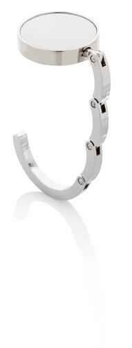 Handtaschen-Halter "Montreux" , ausklappbar: Oberseite Edelstahl für Werbeanbringung - gummierte Unterseite sorgt für sicheren Halt auf Tischoberflächen
