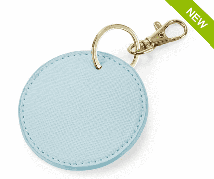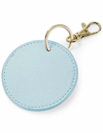 100% Polyurethan (Lederoptik), feines Saffiano, glänzender Metall-Schlüsselclip, Maße: 6x8 cm, max. Druckfläche: 4,5x4 cm