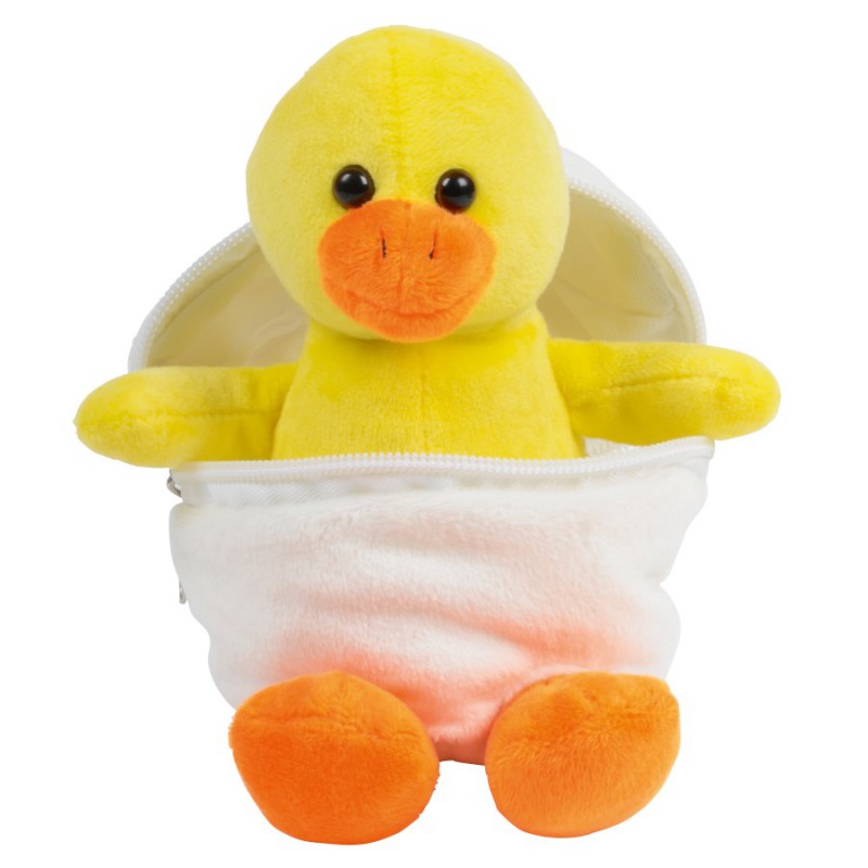 Plüsch-Ente LENI mit weichem Fell, innen Plüsch-Reißverschluss-Ei, mit Herz-Druck.