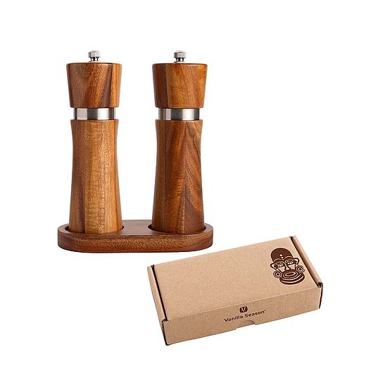Ein elegantes Set aus Pfeffer- und Salzmühlen mit Ständer von Vanilla Season. Die Mühlen bestehen aus Akazienholz mit einem Edelstahlzubehör. Die Schleifsteine sind aus Keramik. Verpackt in einer Geschenkbox.