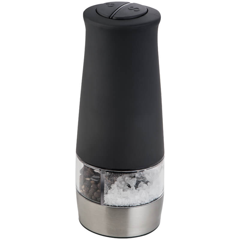 Elektrische Pfeffer- und Salzmühle, beide Hälften können mit 2 separaten Tasten bedient werden. Wir empfehlen, Ihr Logo durch Gravieren zu platzieren.