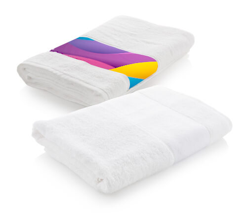 Eine Frottierserie, die speziell für den Sublimationsdruck hergestellt wurde. Durch Sublimation übertragen wir das vollfarbige Original bei einer Temperatur von ca. 200 °C und Pressdruck auf die Oberfläche der weißen Polyesterbordüre. 400g.