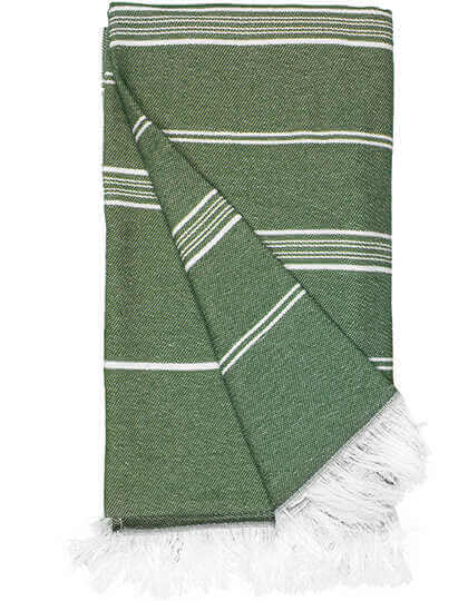 Gestreiftes Design, gedrehte Quasten, leicht und schnell trocknend, Größe: 100x180cm, waschbar bei 40°, wird gerollt geliefert und mit einem Kordelzug aus recycelter Baumwolle gebunden