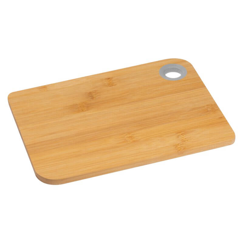 Bambus-Schneidebrett mit abgerundeten Ecken und Silikonring zum Aufhängen oder Tragen. Die Farbe und Musterung der natürlichen Bambusoberfläche kann bei einzelnen Produkten variieren. Druckverfahren Gravur.