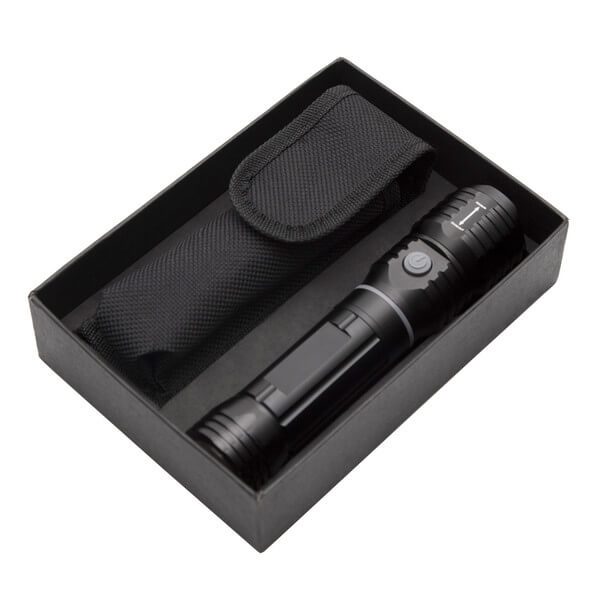 Flashlight with CREE XPG diode 5 W and luminous intensity 250 lm, range 200 m, diode life 100 000 h, zoom function. Includes a retractable flashlight with 16 3 W LEDs (160 lm). Packed in nylon case and gift box. 4 AAA batteries included.
