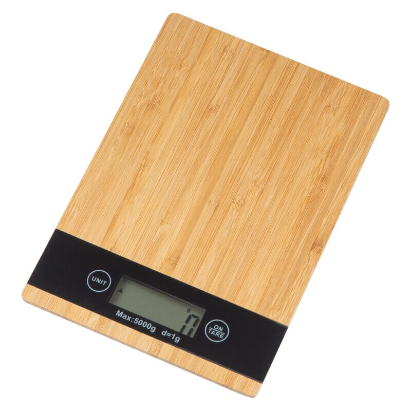 Küchenwaage mit Bambusoberfläche und schwarzer Digitalanzeige. Maximale Tragfähigkeit 5 kg, Anzeige in kg/g/oz/ml, mit 1g Genauigkeit. Druckmethode Gravur.