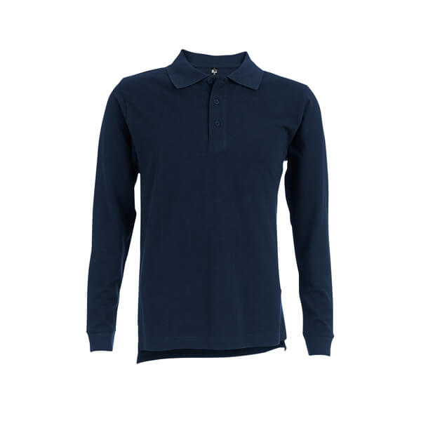 Langarm Herren Poloshirt aus Pique Stoff: 100% Baumwolle (210 g/m²). Bei der Farbe 83 bestehend aus 85% Baumwolle und 15% Viskose, mit gerippter Kragen und Manschetten. Verstärkungsband am Kragen und verstärkte Knopfleiste mit 3 Farbknöpfen. Unten mit seitlichen Öffnungen. Ersatzknopf an der Innennaht. Geschnitten und vernäht.
