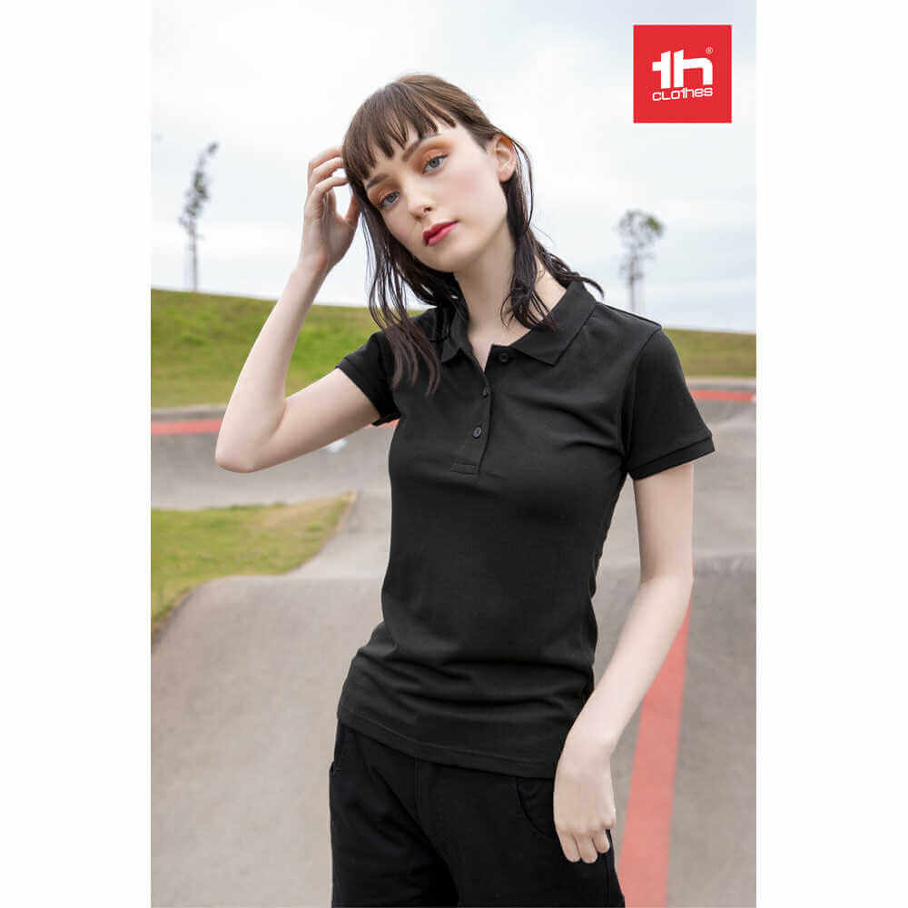 Damen-Poloshirt aus 35% gekämmter Baumwolle und 65% Polyester (200 g/m²) mit kurzen Ärmeln (Farbe: 183: 85% Baumwolle/15% Viskose). Tailliertes Poloshirt mit geripptem Kragen und Ärmeln, der Kragen ist mit einem Bändchen verstärkt. Inklusive verstärktem Kragen mit 3 farbigen Knöpfen (zusätzlicher Knopf in der Innennaht). S, M, L, XL, XXL