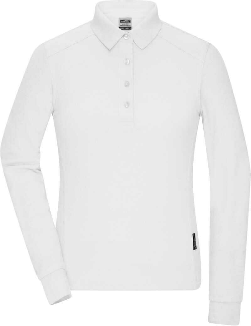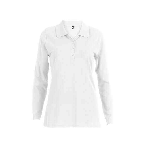 Langarm Damen Poloshirt aus Pique Stoff: 100% Baumwolle (210 g/m²), mit geripptem Kragen und Manschetten, Verstärkungsband am Kragen und verstärkte Knopfleiste mit 4 Farbknöpfen. Unten mit seitlichen Öffnungen. Ersatzknopf an der Innennaht. Tailliert.