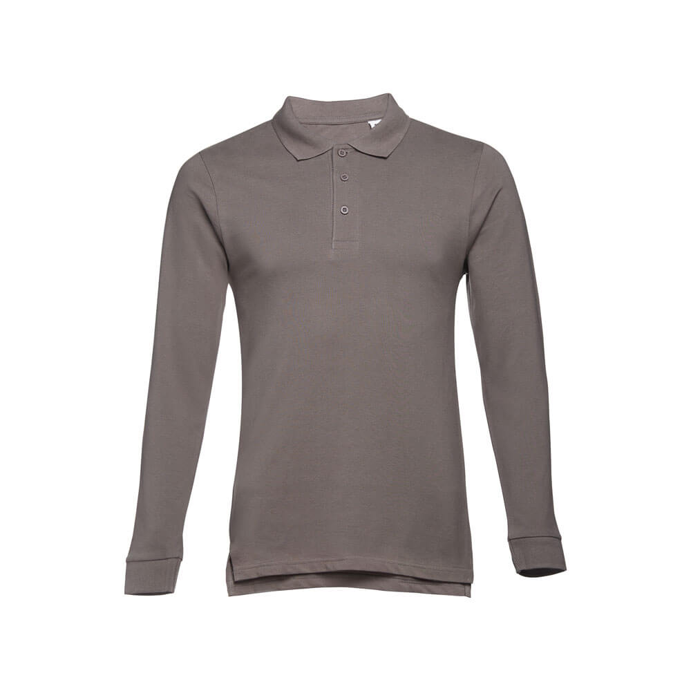 Herren Langarm Piqué-Poloshirt aus 100% Baumwolle (210 g/m²). Farbe 83: 85% Baumwolle/15% Viskose. Gerippter Kragen und Manschetten. Verstärkungsband am Kragen und verstärkte Knopfleiste mit 3 Farbknöpfen. Unten mit seitlichen Öffnungen. Ersatzknopf an der Innennaht. Tailliert.