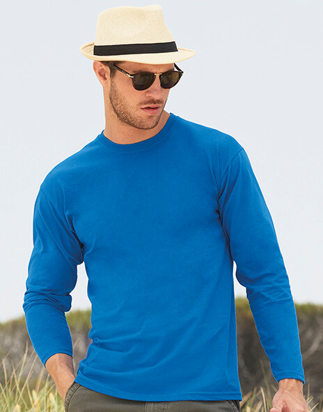 Langarm T-Shirt aus Strickjersey und 100% Baumwolle (150 g/m²), röhrenförmig. Bei den Farben 94, 95 und 99 bestehend aus 60% Baumwolle und 40% Polyester. Mit geripptem Kragen in 1x1 Ripp, Jersey-Verstärkung und Doppelnaht an Ärmeln und Saum.