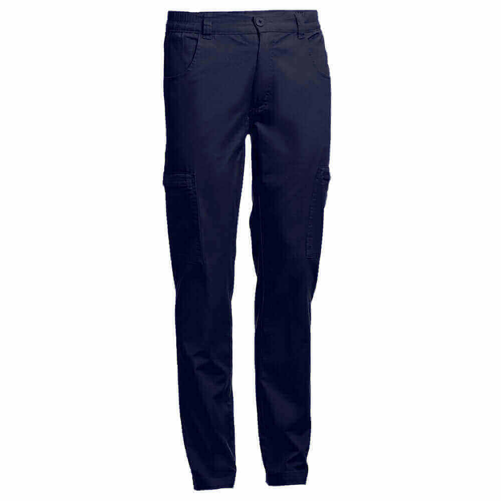 Herren Arbeitshose. 98% Baumwolle und 2% Elasthan: 240 g/m². 6 Taschen: 2 seitliche Reißverschluss-, 2 Front- und 2 Gesäßtaschen. Bund mit seitlichem Gummizug. Slim Fit.