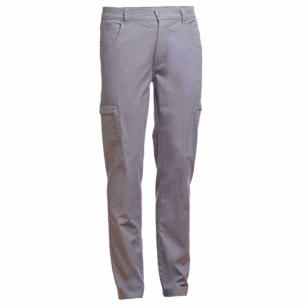 Herren Arbeitshose. 98% Baumwolle und 2% Elasthan: 240 g/m². 6 Taschen: 2 seitliche Reißverschluss-, 2 Front- und 2 Gesäßtaschen. Bund mit seitlichem Gummizug. Slim Fit.